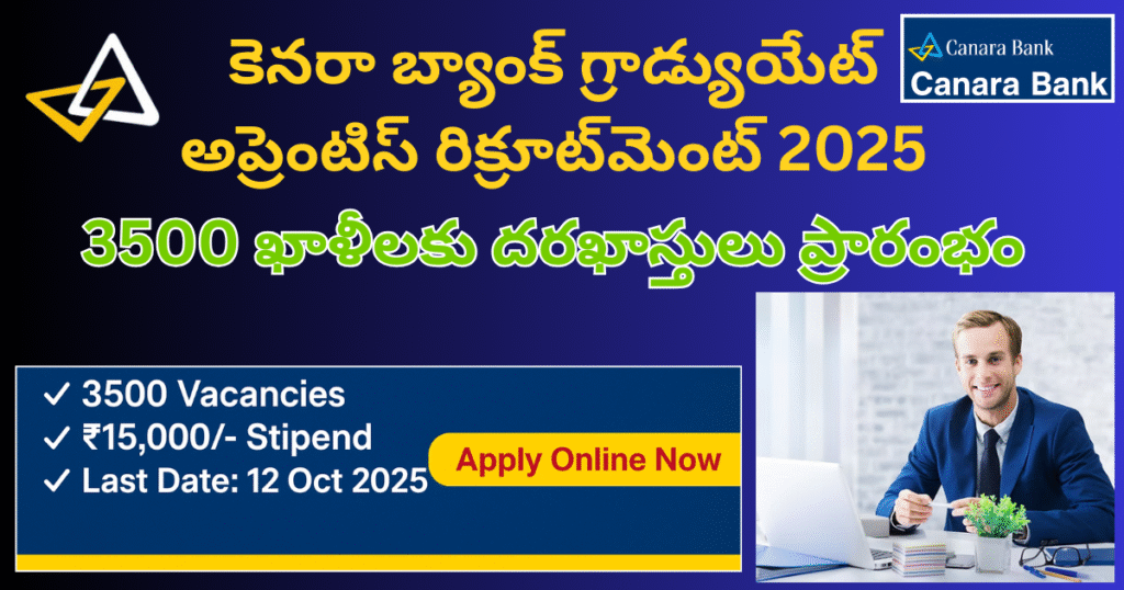 కెనరా బ్యాంక్ గ్రాడ్యుయేట్ అప్రెంటిస్ రిక్రూట్మెంట్ 2025 అనేది బ్యాంకింగ్ రంగంలో కెరీర్ ప్రారంభించాలనుకునే వారికి అద్భుతమైన అవకాశం. అర్హత ఉన్న ప్రతి ఒక్కరూ 12 అక్టోబర్ 2025 లోపు తప్పక దరఖాస్తు చేసుకోవాలి.